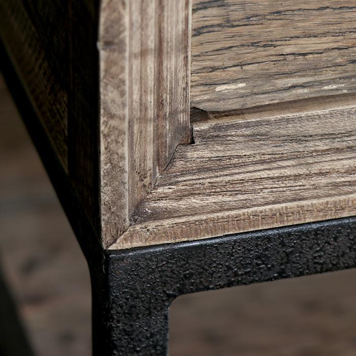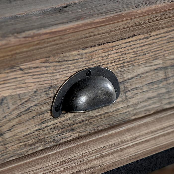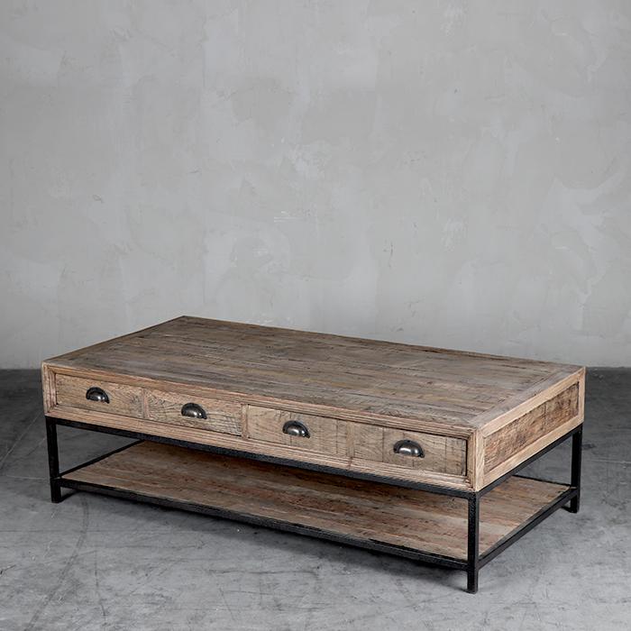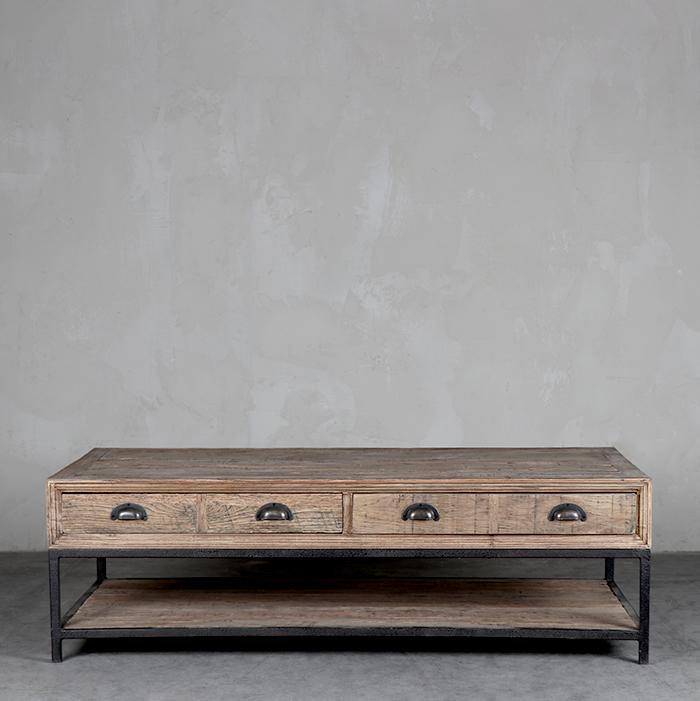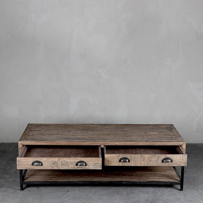 Mesa de centro estructurada en metal que soporta cuatro cajones y cubierta de madera de roble asiático reciclado. Tiradores concha que le entregan al mueble una apariencia retro.