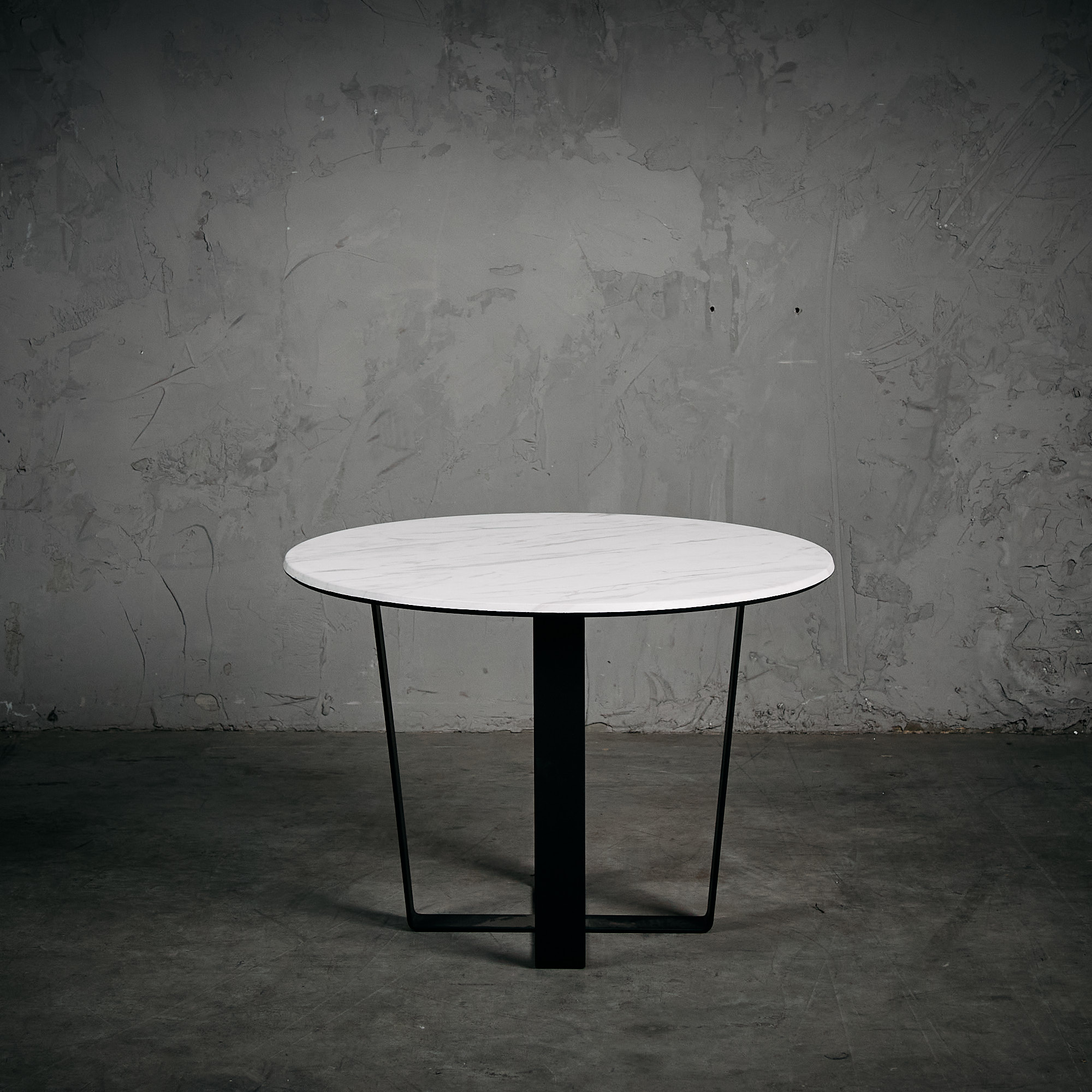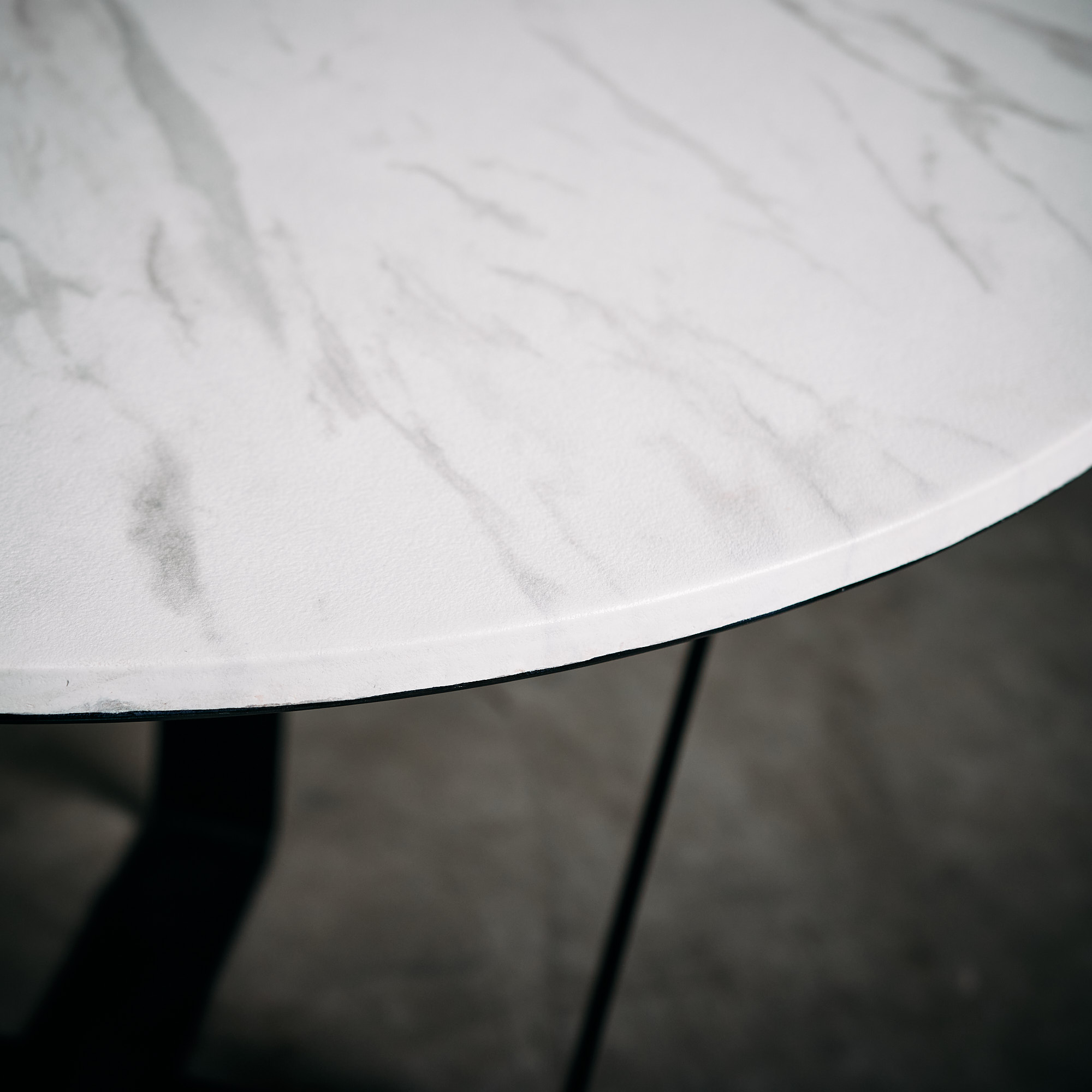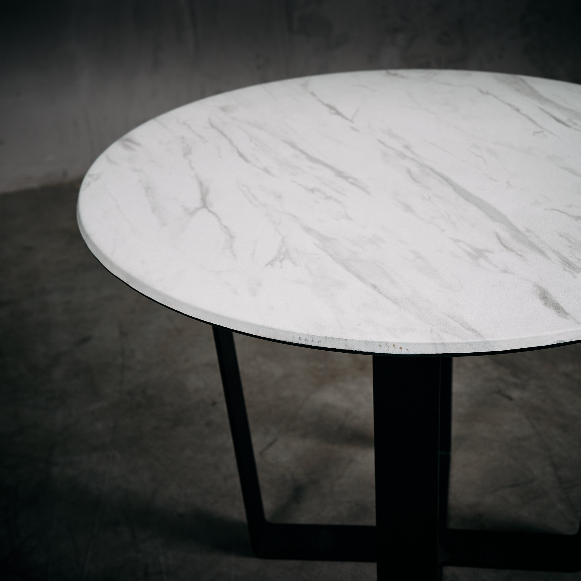 Mesa con cubierta tipo mármol y patas de fierro. Esta cubierta tiene una tecnología que resiste rayos UV, es resistente a los golpes, al fuego y al derrame de líquidos.