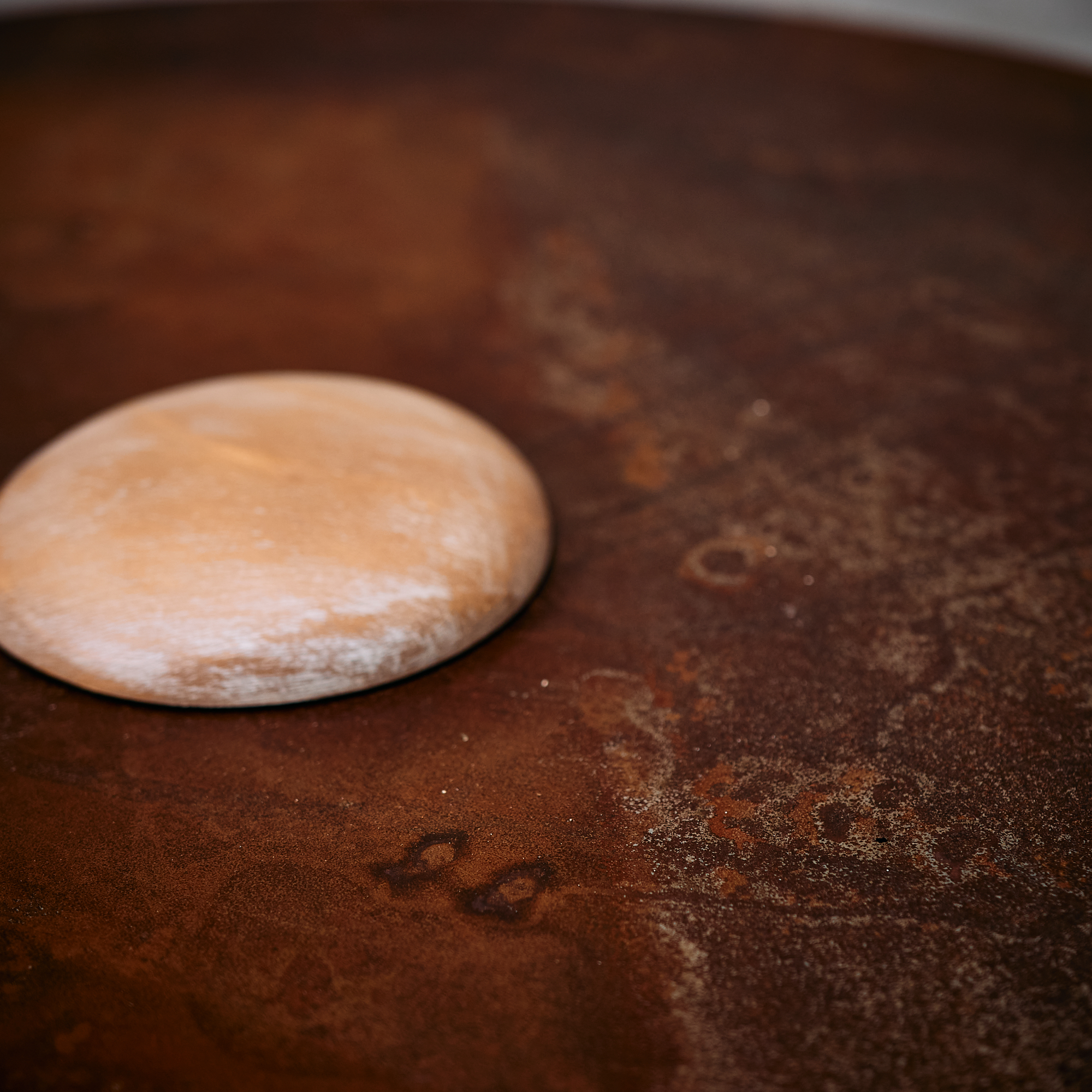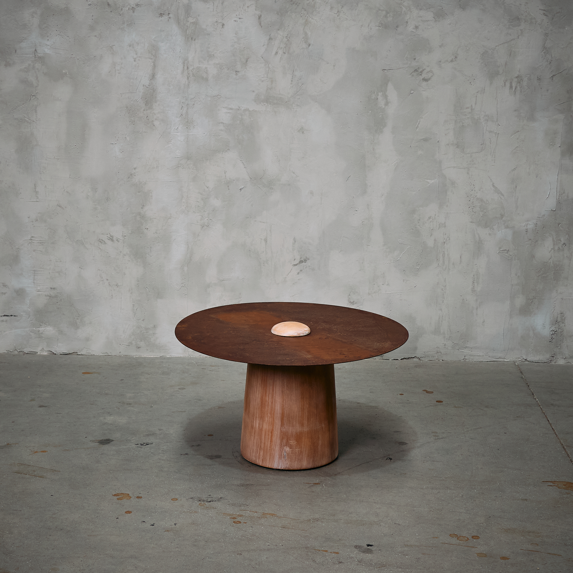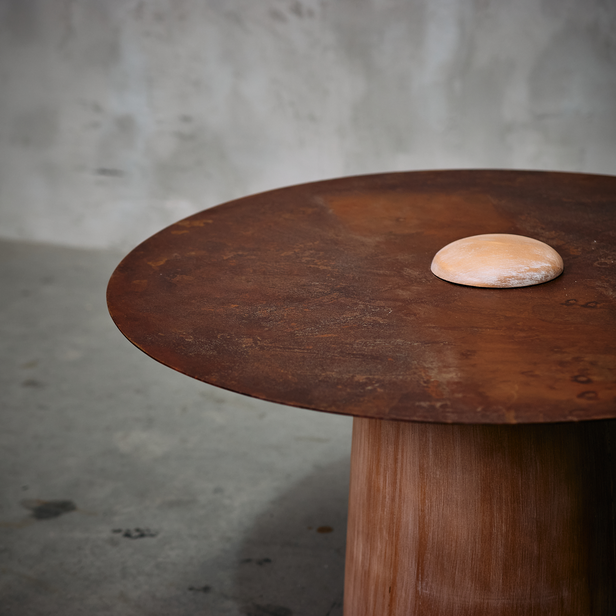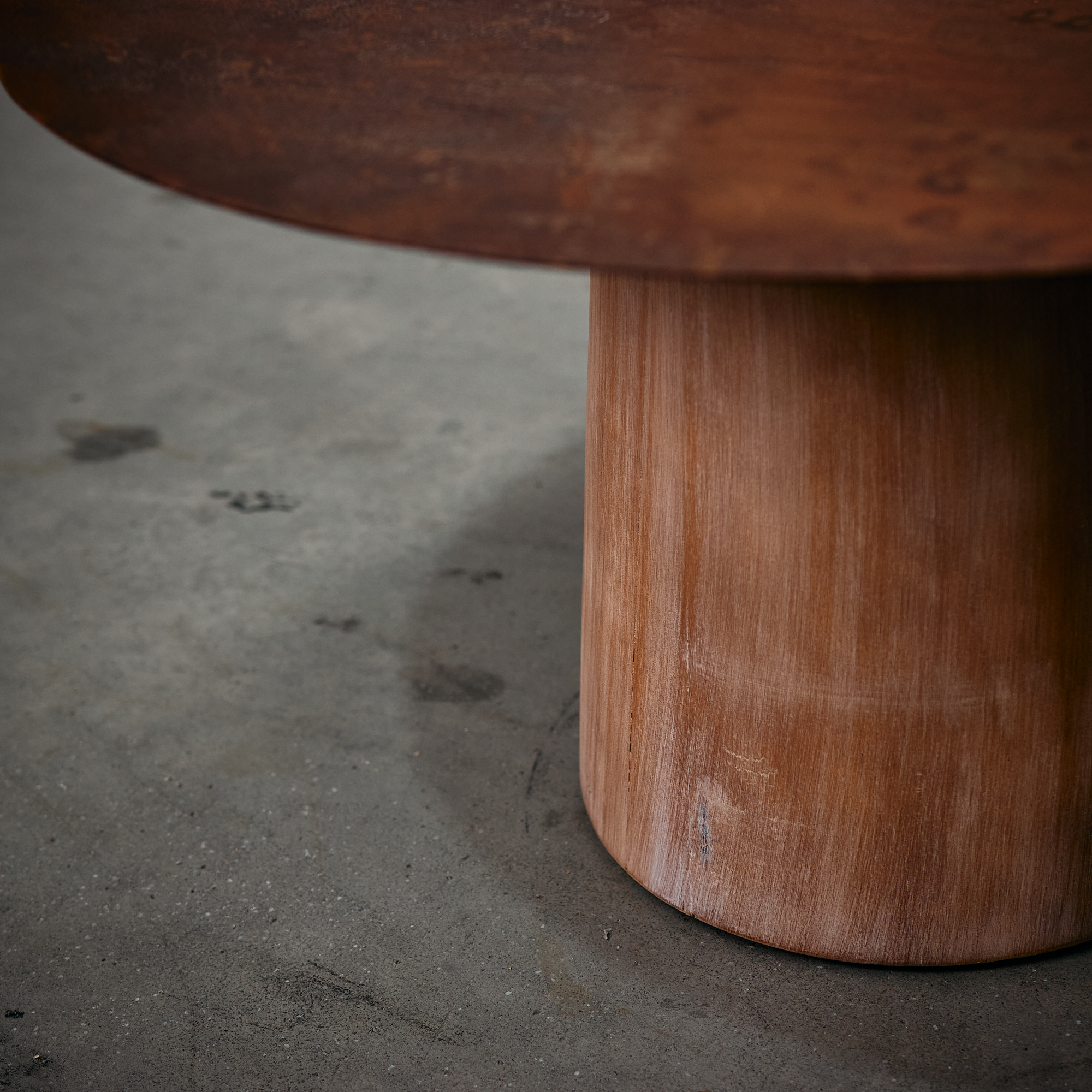 Mesa fabricada en una combinación de madera de pino en su base donde resaltan las vetas y cubierta de acero corten.