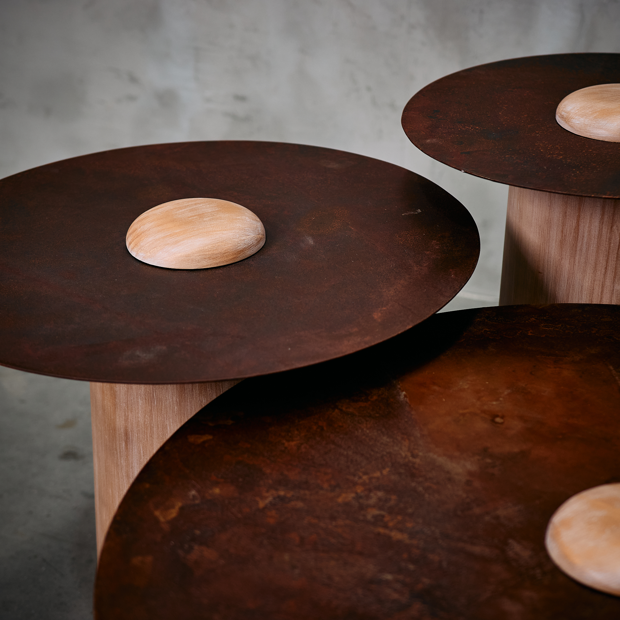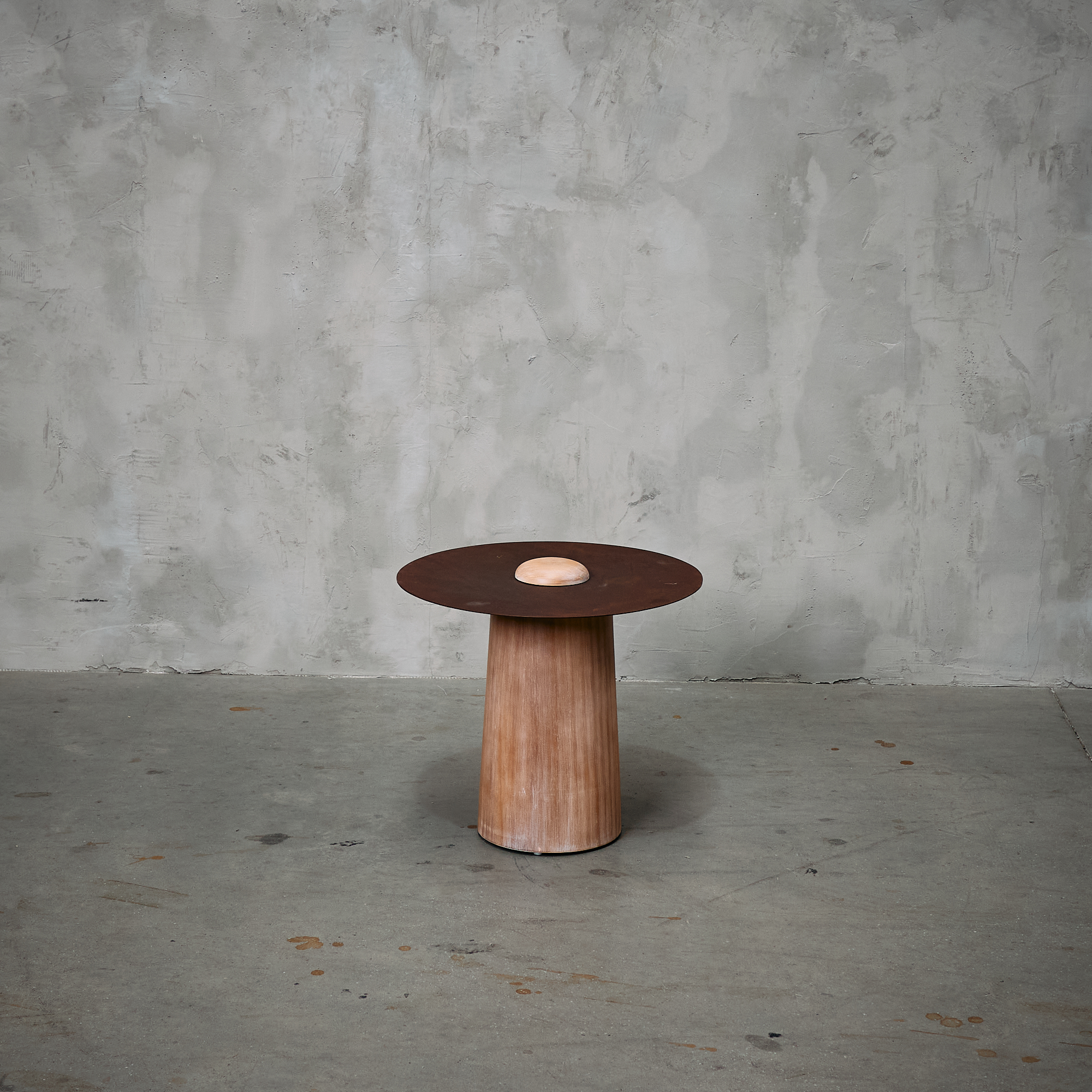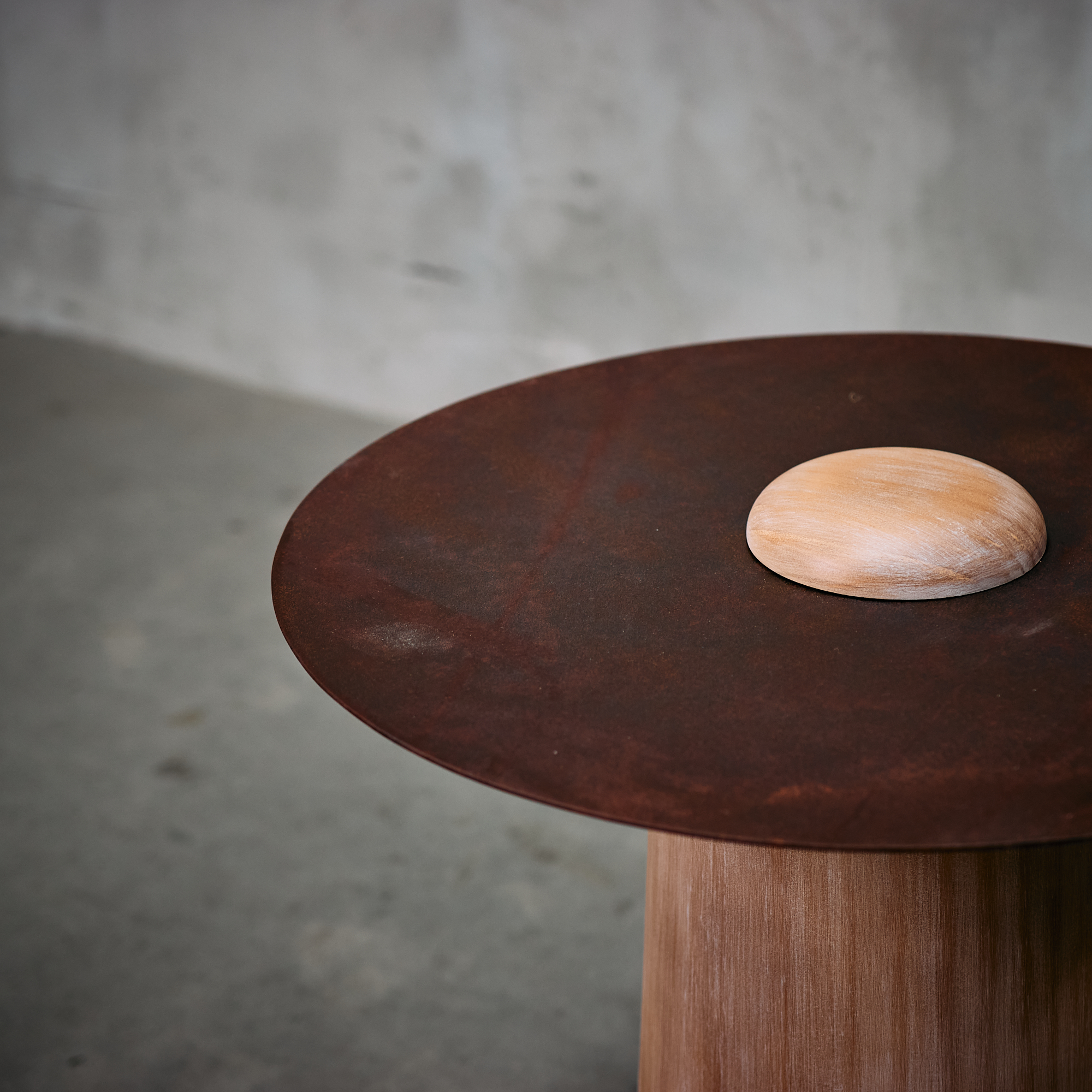Mesa fabricada en una combinación de madera de pino en su base donde resaltan las vetas y cubierta de acero corten.