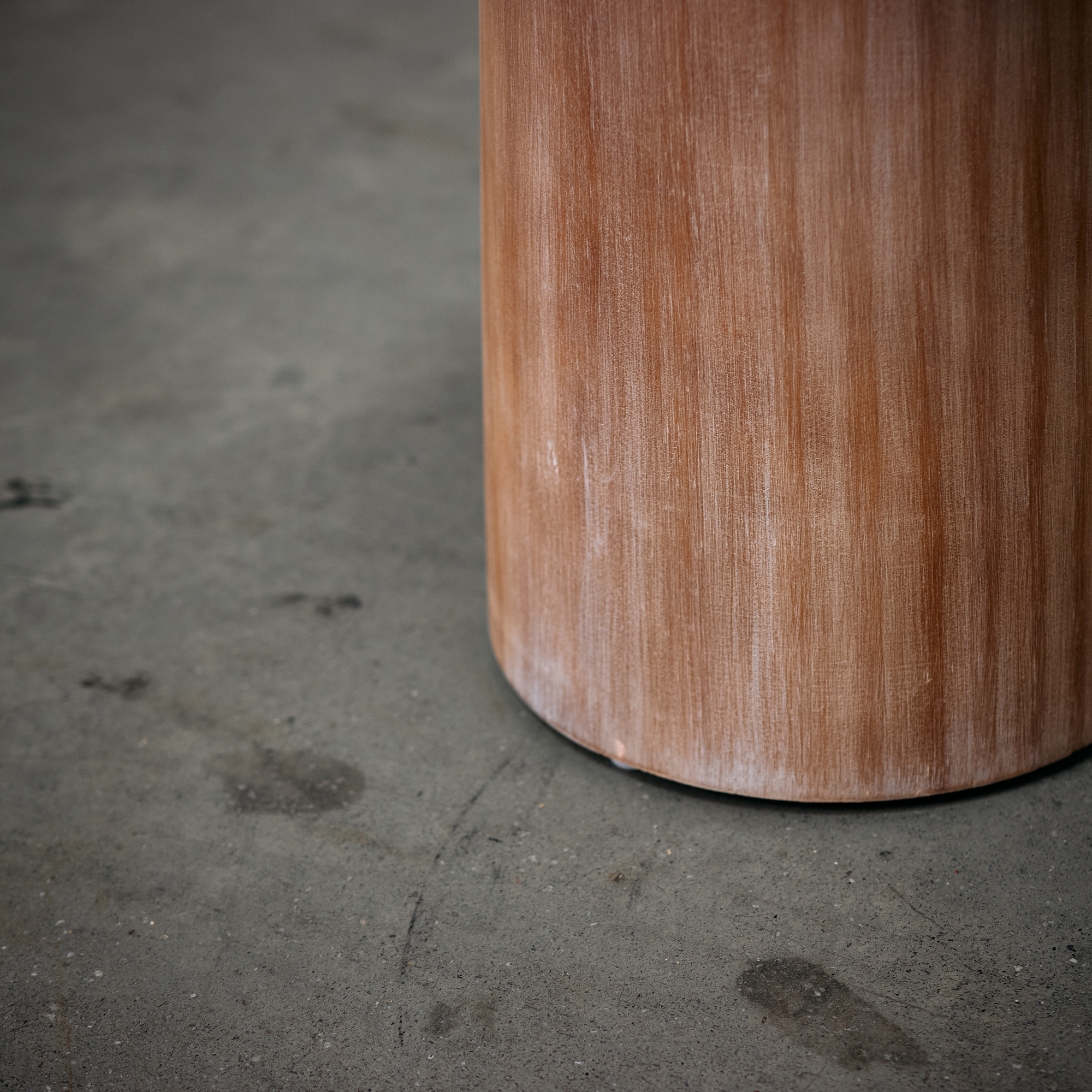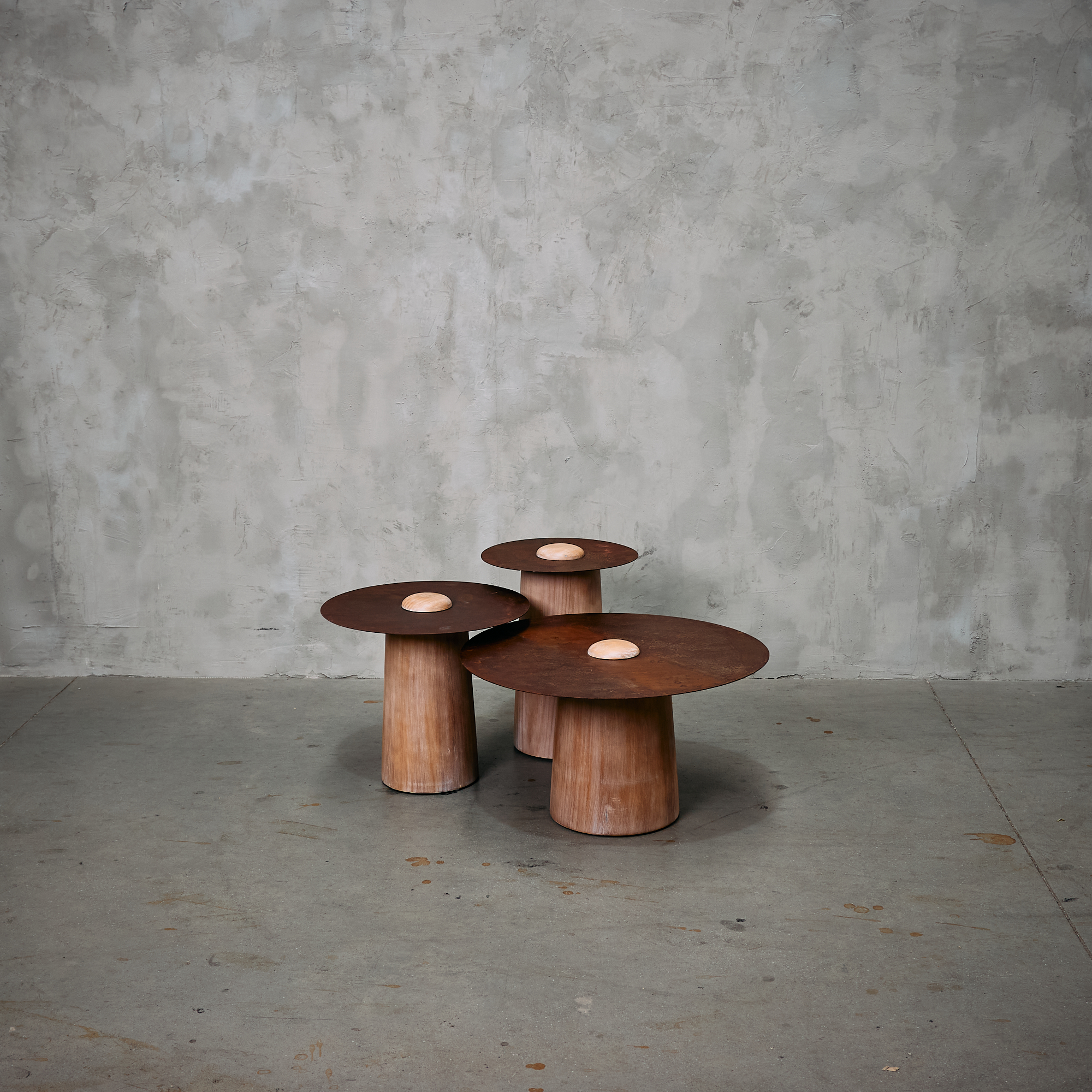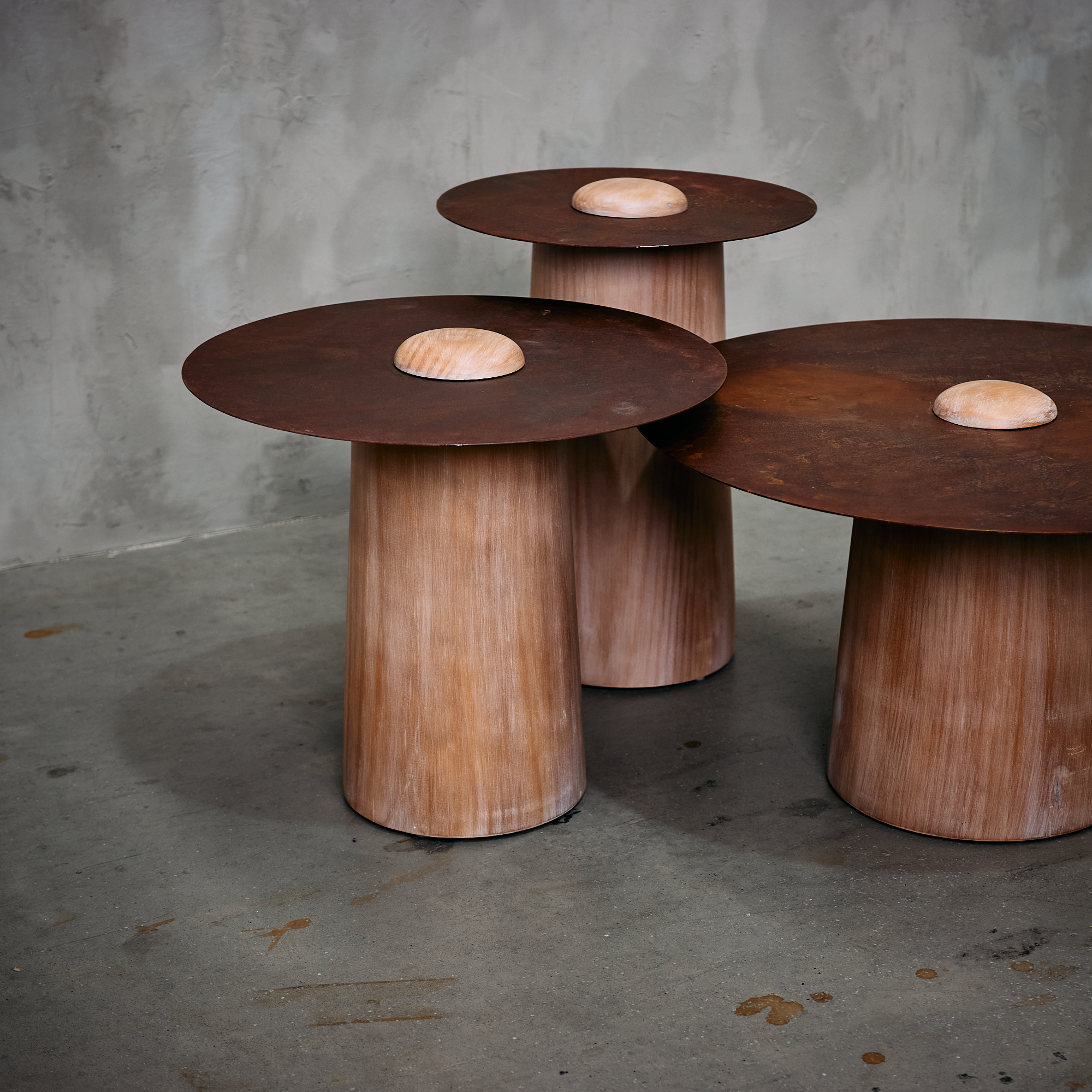 Mesa fabricada en una combinación de madera de pino en su base donde resaltan las vetas y cubierta de acero corten.