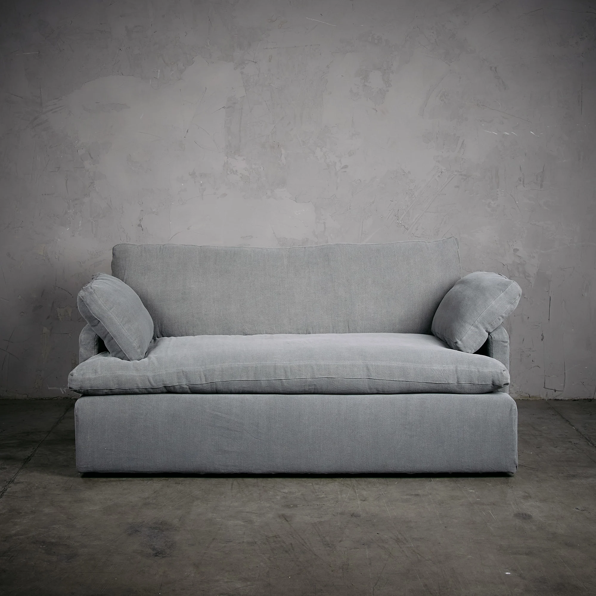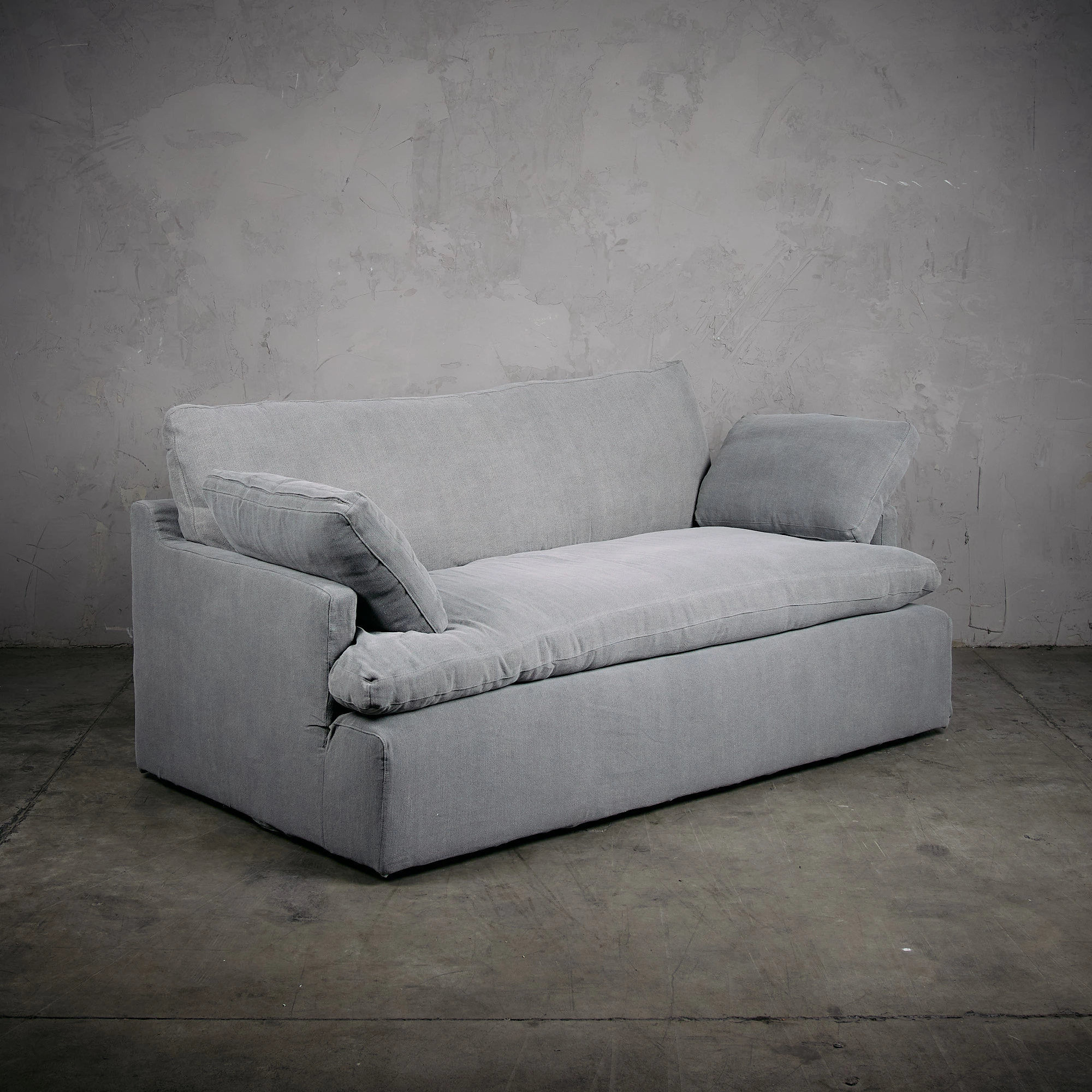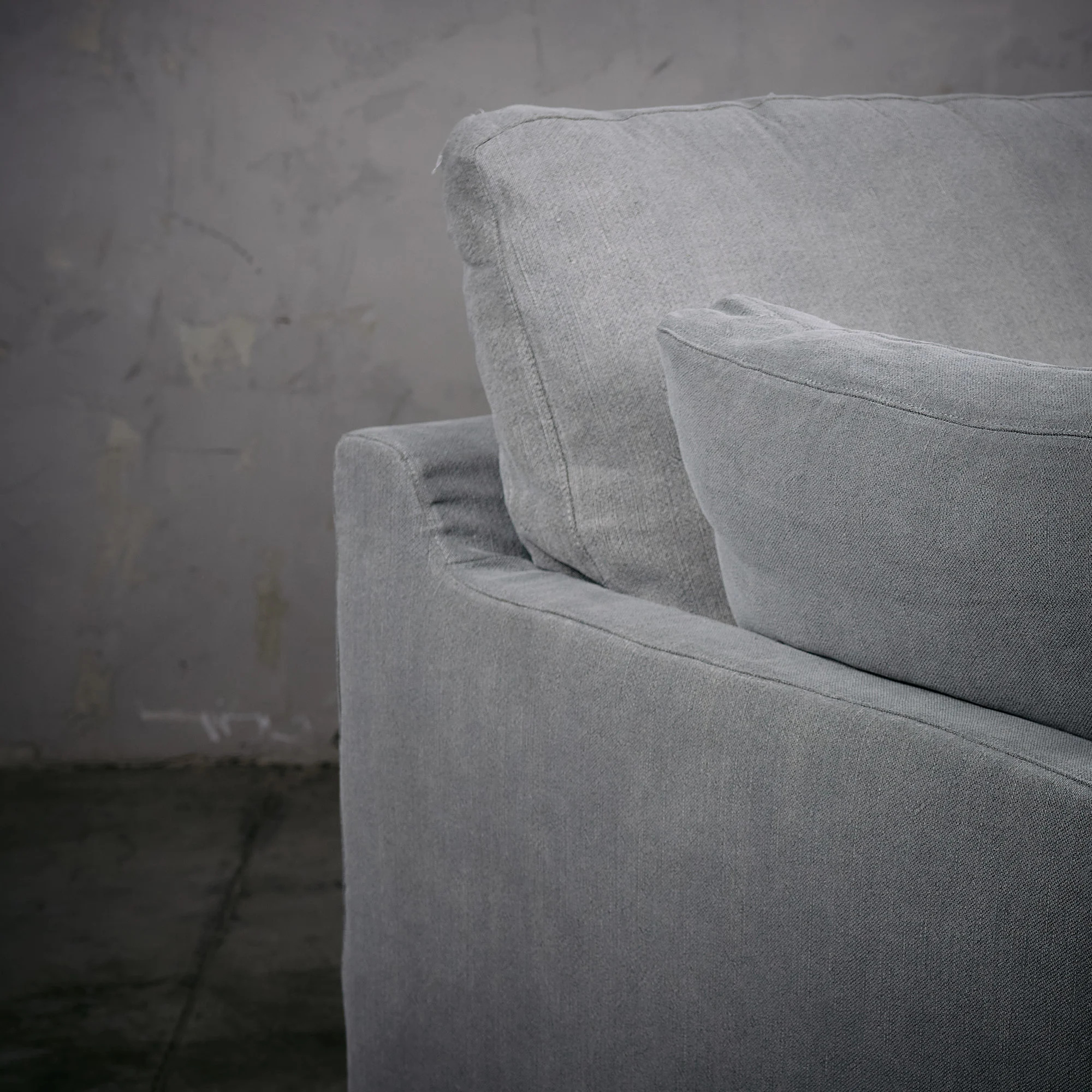 Sofá de dos cuerpos relleno de pluma y funda de velcro en color gris. 60% lino y 40% algodón